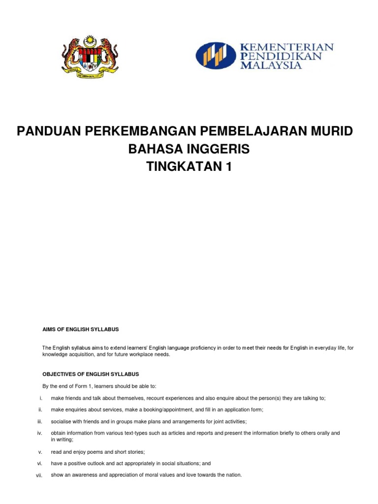 Panduan Perkembangan Pembelajaran Murid Bahasa Inggeris Tingkatan 1 Pdf English Language Knowledge