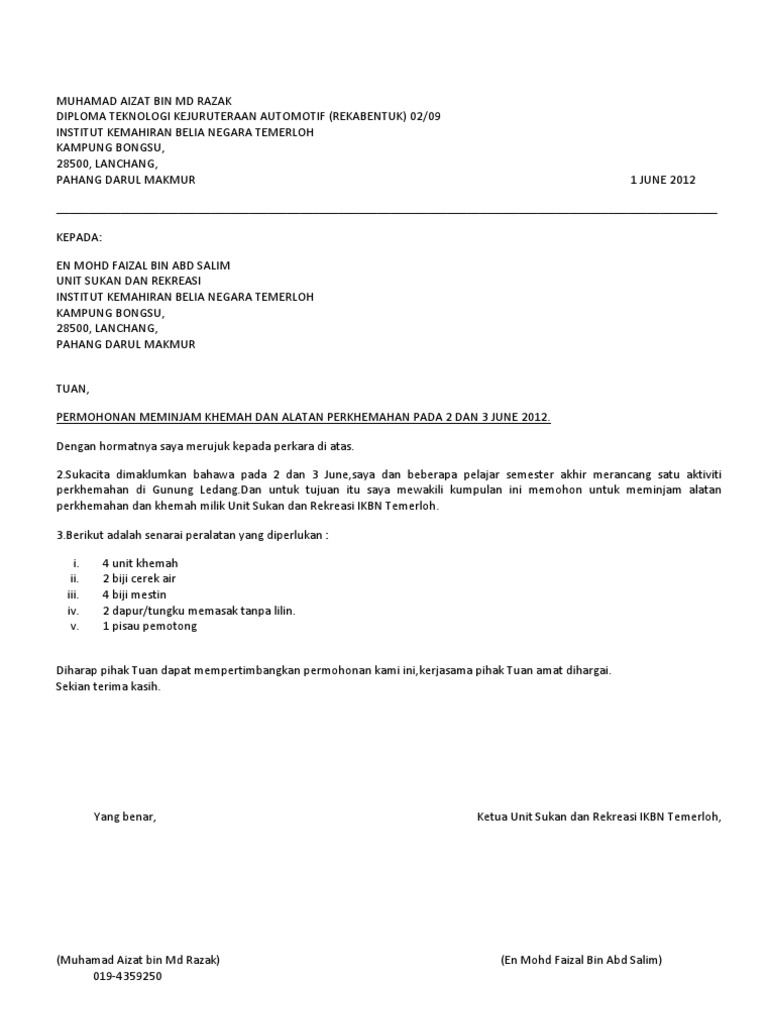 Contoh Surat Bagi Meminjam Alatan Rekreasi Perkhemahan Pdf
