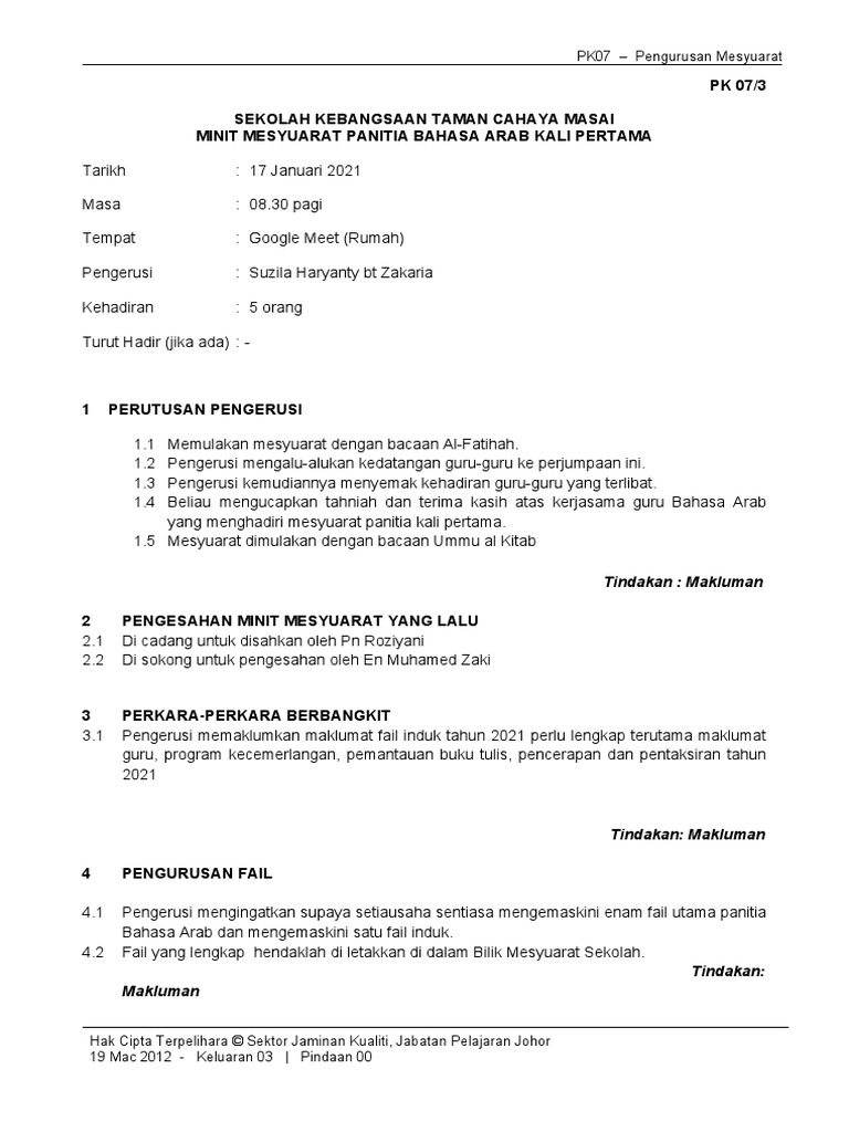 Contoh Minit Mesyuarat Format Terkini 2021 Portal Cikgu